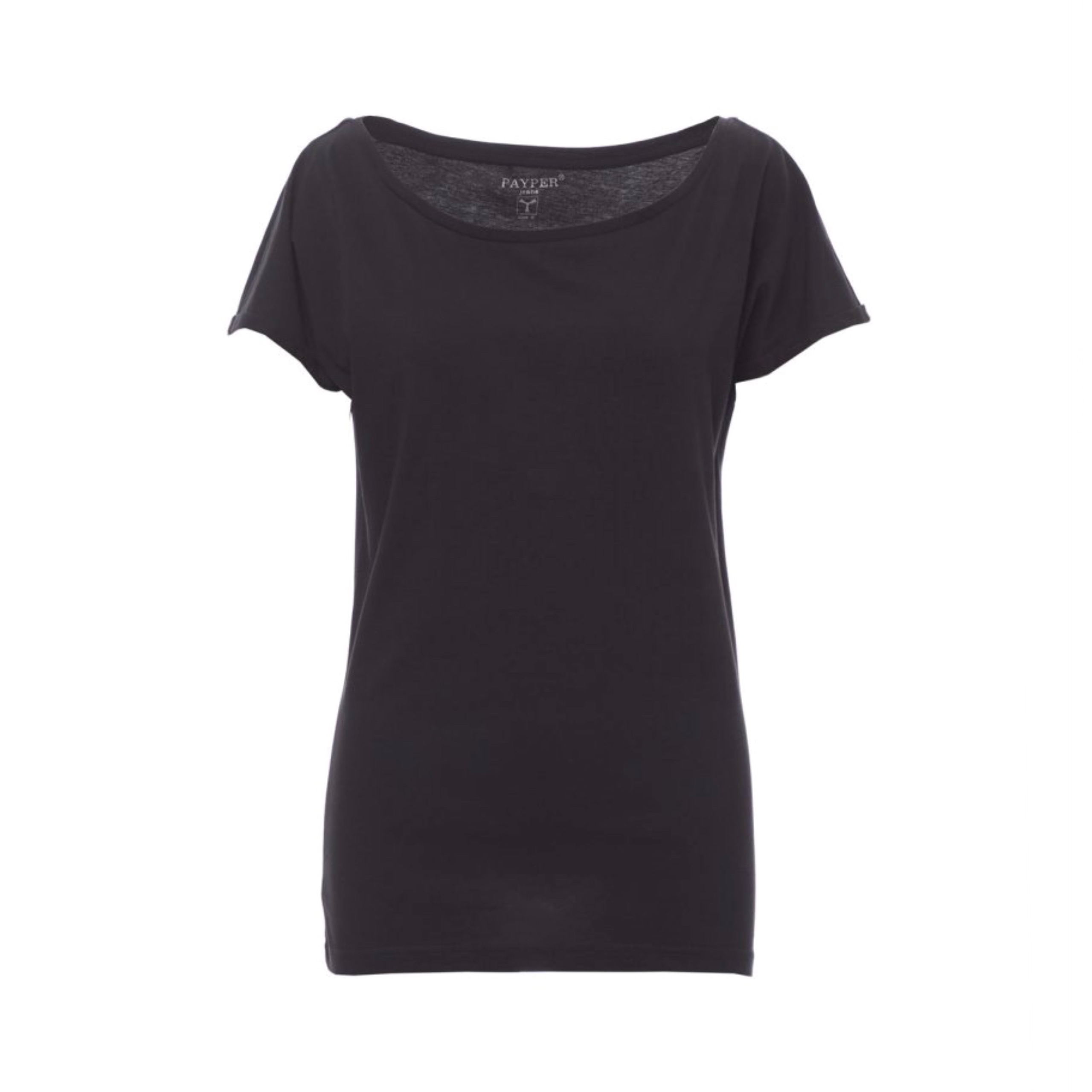 T-shirt manica corta sfiancata da donna con scollo a barchetta, colletto basso da 1cm, maniche corte e strette finite con fine risvolto, cucita lateralmente.
