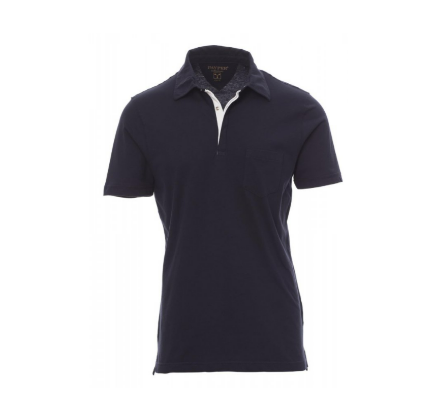 Polo manica corta a tre bottoni automatici a clips di metallo, apertura frontale del collo più fine e profonda, etichetta transfer, taschino lato cuore.