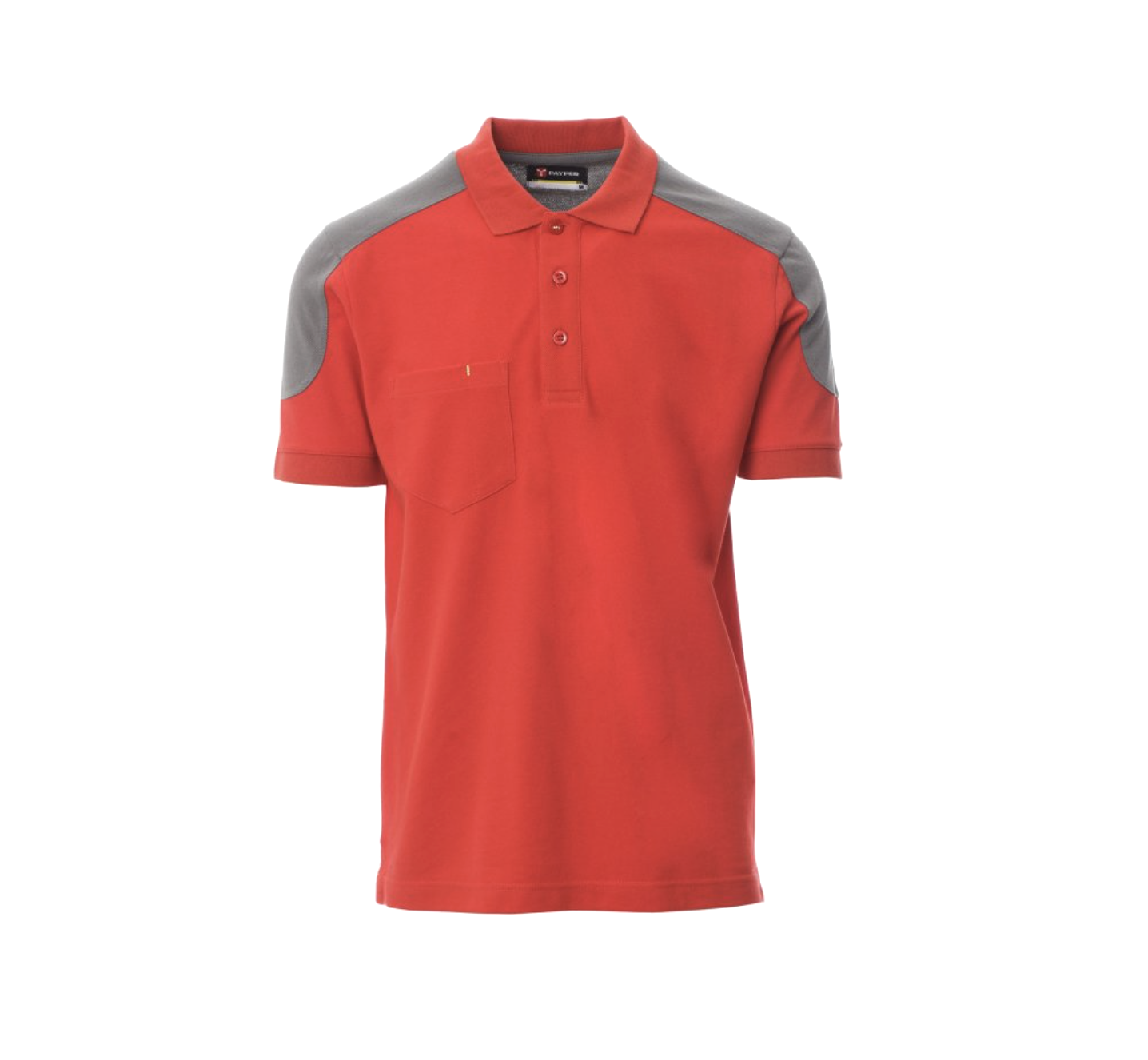 Polo bicolore a manica corta con 3 bottoni in tinta, taschino al petto con portapenna, bordo maniche a costine, spacchetti laterali, cuciture del collo coperte.