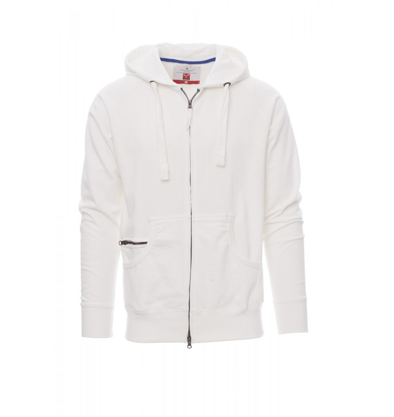 Felpa da uomo, zip intera SBS coperta con doppio cursore in metallo, cappuccio con due cuciture, coulisse bianca con cuciture in tinta con la felpa e anelle in metallo, manica raglan, tasche a marsupio con taschino con zip, polsini e vita in costina elasticizzata. Cuciture rinforzate.