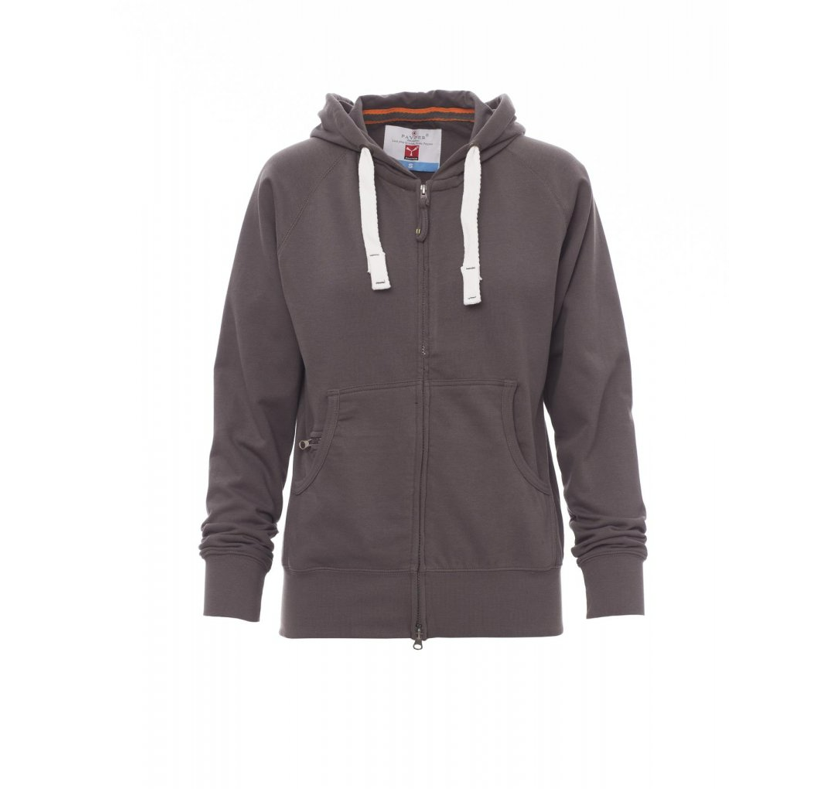Felpa sfiancata da donna, zip intera SBS coperta con doppio cursore in metallo, cappuccio con due cuciture, coulisse bianca con cuciture in tinta con la felpa e anelle in metallo, manica raglan, tasche a marsupio con taschino zip, polsini e vita in costina elasticizzata. Cuciture rinforzate.