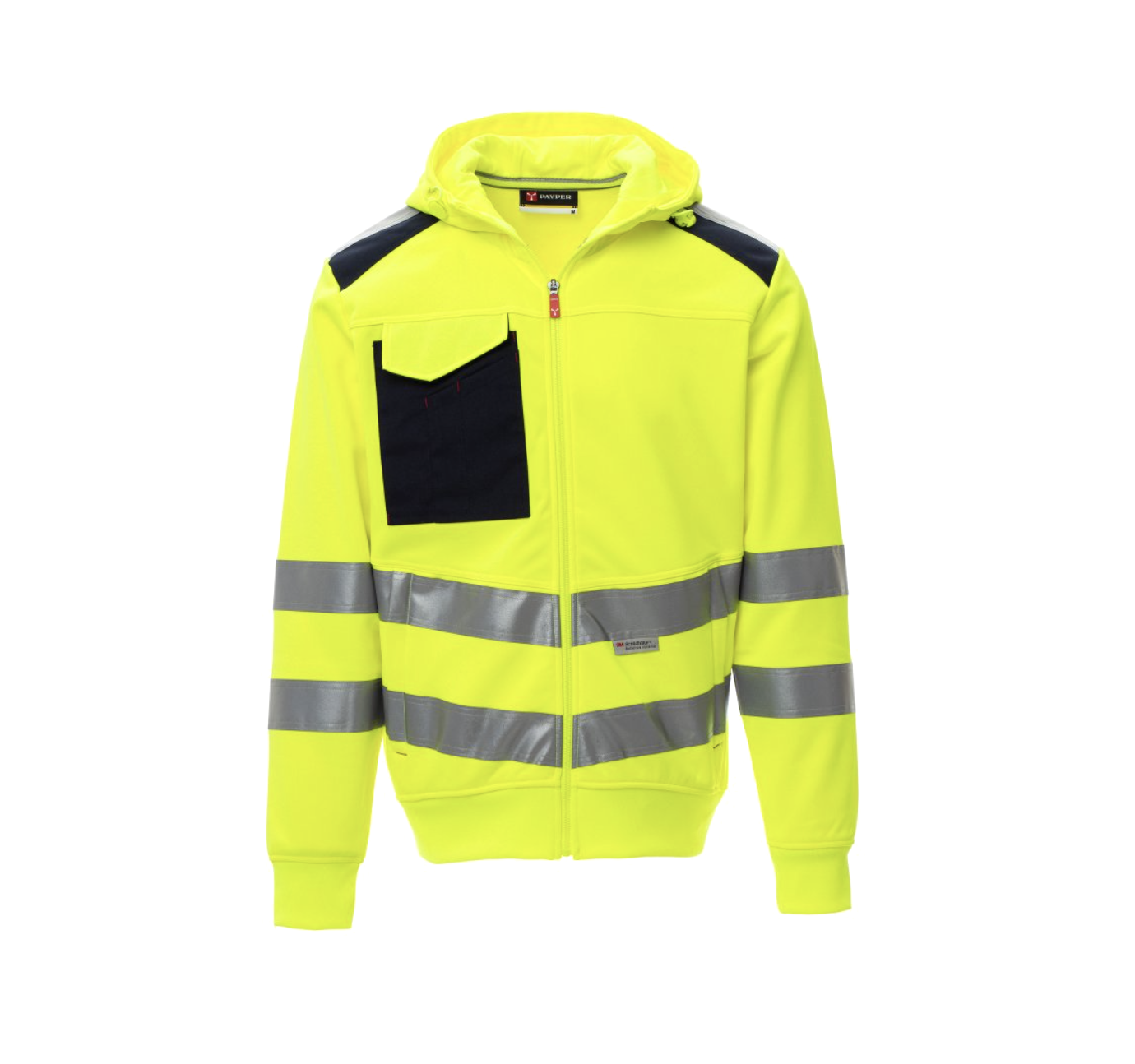 Felpa da uomo in alta visibilità con cappuccio e bande riflettenti, zip intera SBS con cursore in metallo autolock, polsini e vita in costina elasticizzata, due tasche frontali con zip coperta, una tasca multifunzione al petto con anello porta badge e patta di chiusura LOCK SYSTEM.