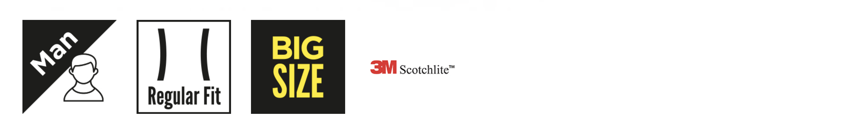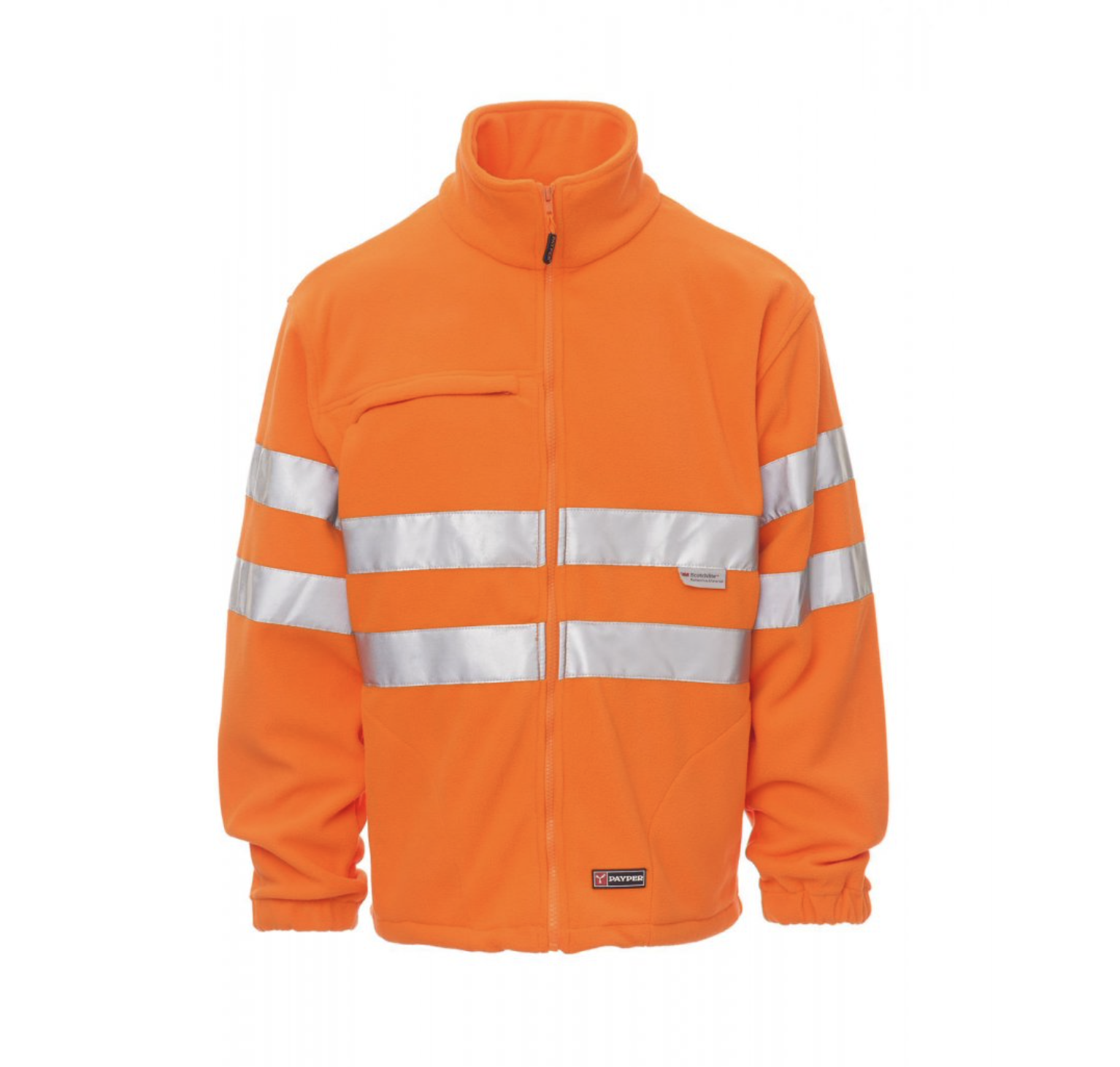 Pile uomo in alta visibilità con bande 3M, zip intera in plastica, coulisse regolabile in vita, elastici stringi polso, due tasche con zip, una tasca frontale con zip, cuciture rinforzate.
