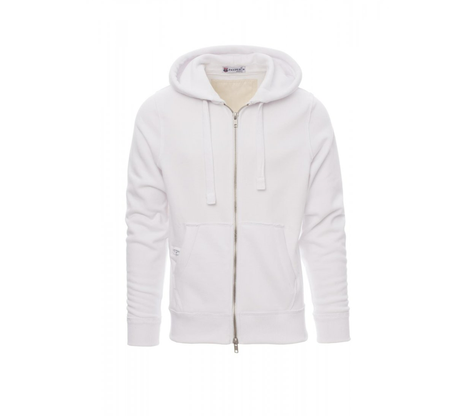 Felpa da uomo, zip intera SBS in metallo con doppio cursore, cappuccio con due cuciture, coulisse bianca in corda con cuciture in in tinta con la felpa e anelle in metallo, tasche a marsupio, taschino con zip e predisposizione per cavo mp3/cellulare, polsini e vita in costina elasticizzata, cuciture rinforzate, finiture di ispirazione vintage. Etichetta interna personalizzabile.