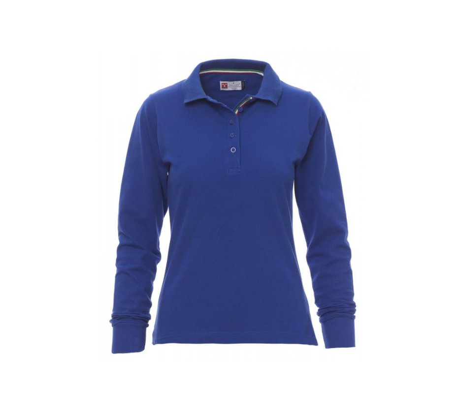 Polo sfiancata da donna manica lunga a cinque bottoni in tinta ad effetto perlato, colletto da un lato in tinta, dall’altro lato a contrasto tricolore, visibile solo se alzato, interno abbottonatura collo e spacchetti laterali con inserto tricolore, colletto e polsino a costine, cuciture del collo coperte, nastro di rinforzo laterale.