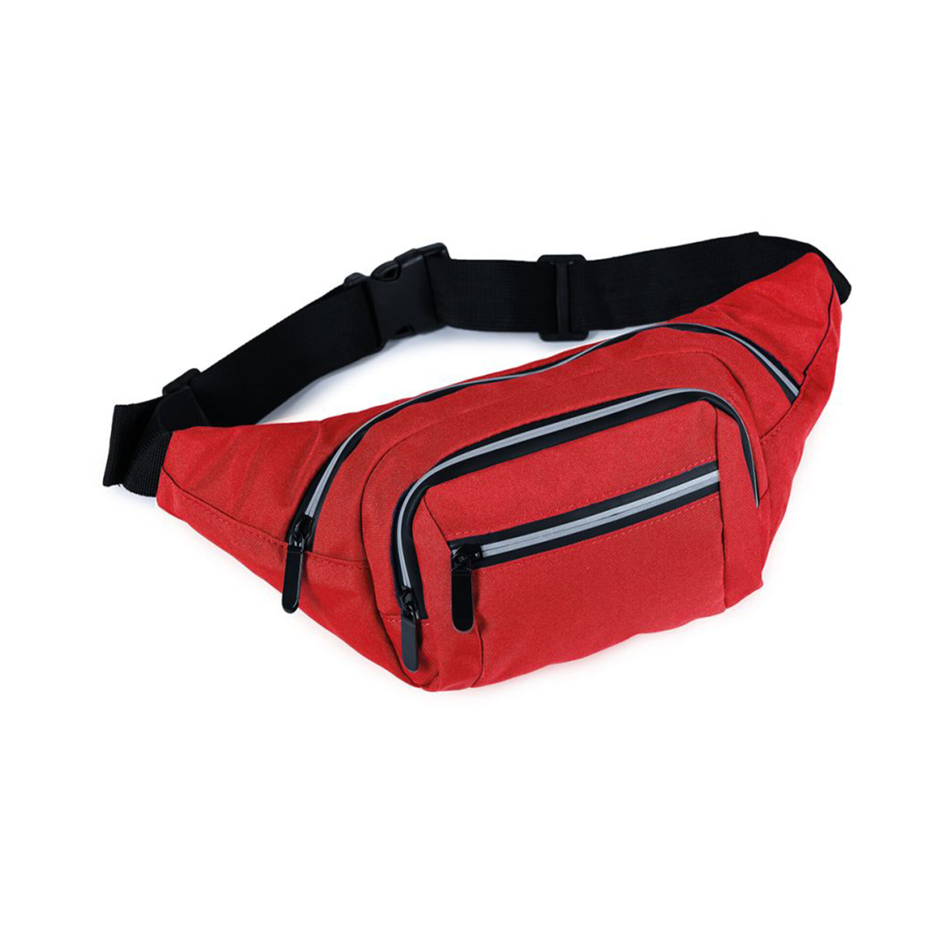 Marsupio multitasche in RPET, due tasche frontali e tasca sul retro con chiusura a zip, copri cerniere catarifrangenti, cinghia regolabile.