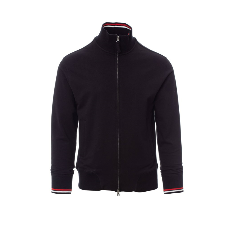 Felpa da uomo, zip intera coperta in plastica con doppio cursore easy zip in metallo. Vita, colletto e polsini in rib. Profili con righe a contrasto, due tasche laterali.