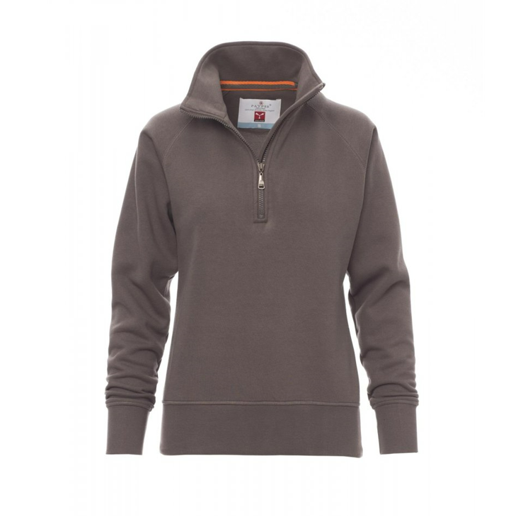 Felpa da donna, mezza zip in tinta, in plastica con cursore in metallo, manica raglan, polsini e vita in costina elasticizzata, cuciture rinforzate.