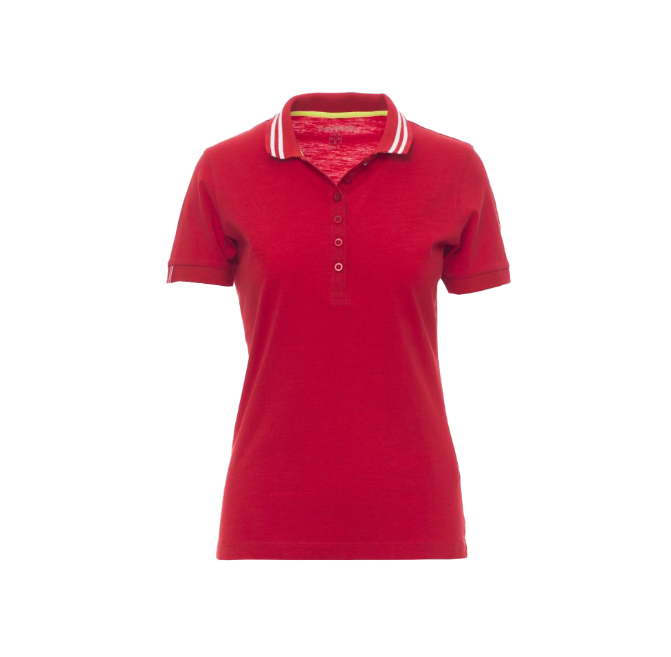 Polo sfiancata da donna manica corta a sei bottoni in tinta effetto perlato, colletto da un lato con righe a contrasto e dall’altro con righe fluorescenti visibili solo se alzato, colletto e bordo maniche a costine, la destra con fine inserto, spacchetti laterali e cuciture del collo coperte con nastro fluo, etichetta transfer.