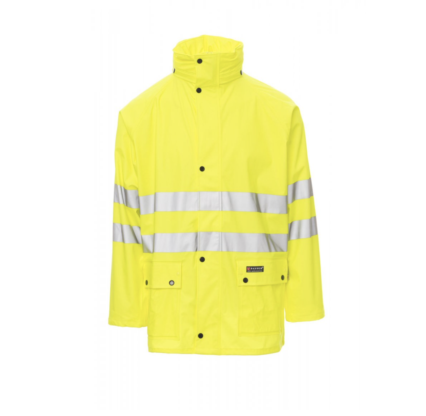 Giacca antipioggia in alta visibilità con bande 3M, manica raglan, zip intera in nylon e patta con bottoni automatici, cappuccio richiudibile nel colletto, coulisse in vita, fondo manica dritto con polsino elasticizzato interno, due tasche a busta con patta. Bande e cuciture termosaldate.