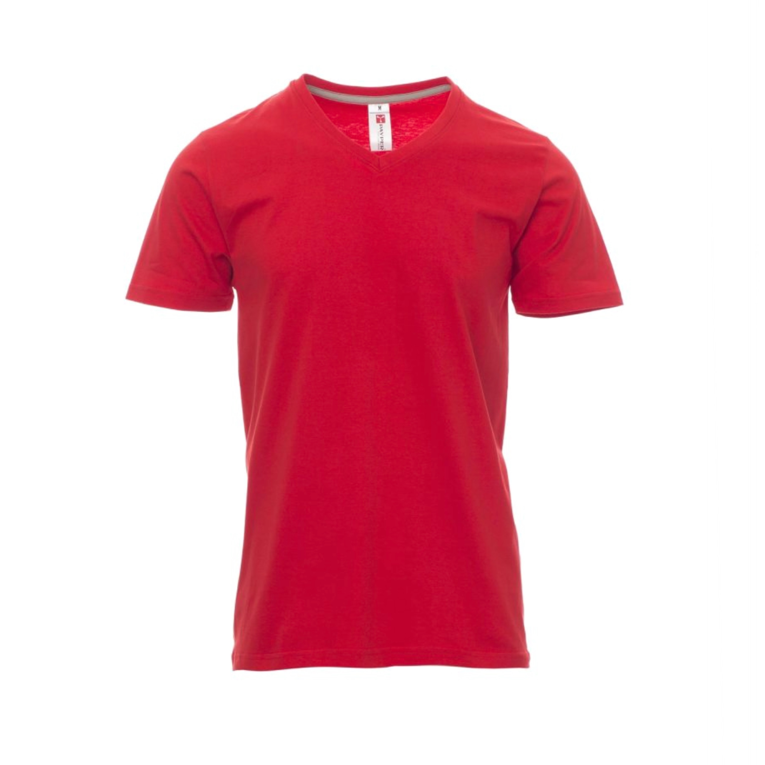 T-shirt da uomo collo a V manica corta, colletto in costina misto spandex da 1,5 cm con cucitura ribatutta sul davanti, nastro di rinforzo da spalla a spalla in colore a contrasto visibile nel colletto, cuciture stretch, struttura tubolare.